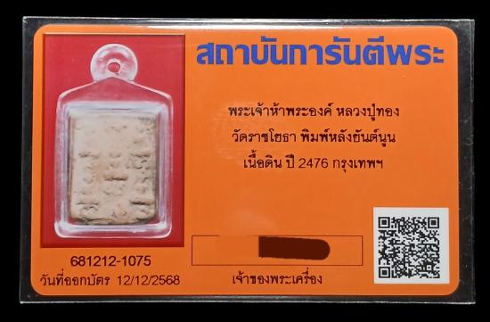 เคาะเดียวเบาๆ...พระหลวงปู่ทอง พิมพ์พระเจ้าห้าพระองค์ หลังยันต์ เนื้อดิน วัดราชโยธา ปี2476 จ.กรุงเทพ คัดสวยๆมาเลยครับ พร้อมบัตรรับรอง