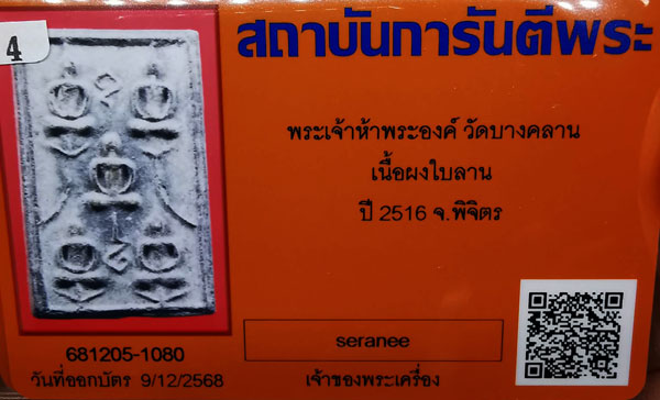 พระเจ้าห้าพระองค์ วัดบางคลาน เนื้อผงใบลาน ปี2516 จ.พิจิตร + บัตรG-pra สภาพเดิมค่ะ สภาพตามรูปทุกประการค่ะ