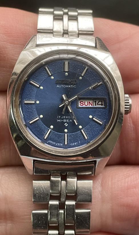 รายละเอียด นาฬิกา Seiko Hi-Beat Automatic 17jewels 24mm.(ไม่รวมเม็ดมะยม) 2 หน้าต่าง หน้าปัดสีน้ำเงินคลาสสิค วันและวันที่ ปรับเปลี่ยนเร็วได้ สามารถขึ้นลานมือช่วยได้ เดินปกติ สภาพสวย น่าใช้งาน