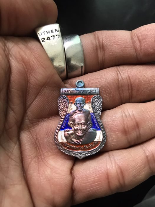 สวยจริงๆ เดิมๆขึ้นรุ้ง เหรียญหลวงปู่ทวด อาจารย์ทอง วัดสำเภาเชย พิมพ์พุทธซ้อน รุ่นพระธาตุเจดีย์ เนื้อเงินลงยาลายธงชาติ ปี 2549 จ.ปัตตานี