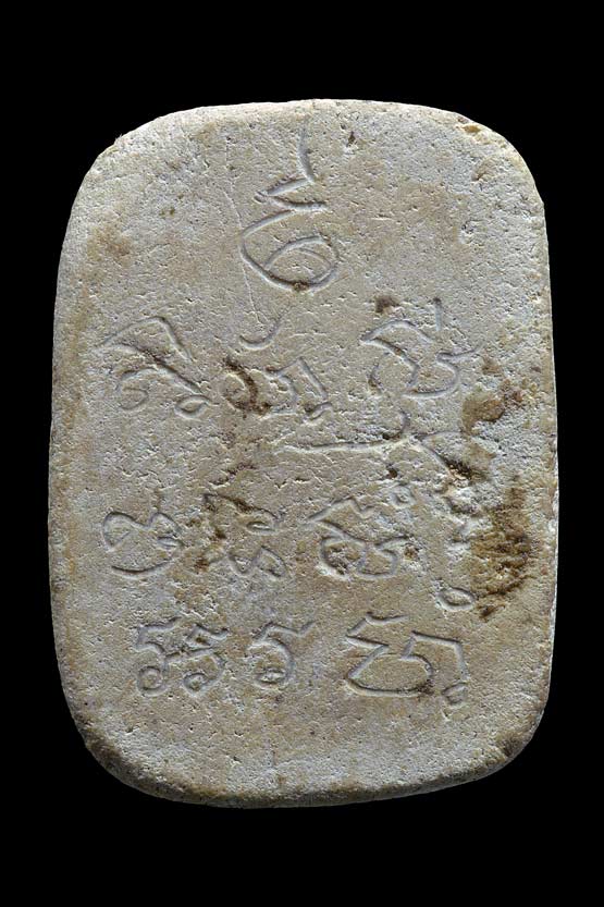 30.พระพิมพ์สามเหลี่ยม ปางประทานพร ด้านหน้ายันต์พุทโธ ด้านหลังยันต์เฑาะว์ เนื้อผงสีเทา ( คุณสุขสันต์ พรจินดา " โกหย่ง " ศิษย์วัดนครอินทร์ สร้างถวาย ประมาณราวๆ 2000 องค์ มีหลายๆองค์ ที่ฝังตะกรุดชายจีวร หลวงพ่อคูณ ขนาด ยาว 1.5 เซนติเมตร ความหนาเท่าๆก้านไม้ขีด ไว้ที่ขอบฐานด้านล่างขององค์พระ เพื่อความแตกต่างเลยผสมผงธูปเข้าไปด้วย สีขององค์พระเลยออกมาโทนสีเทา |
