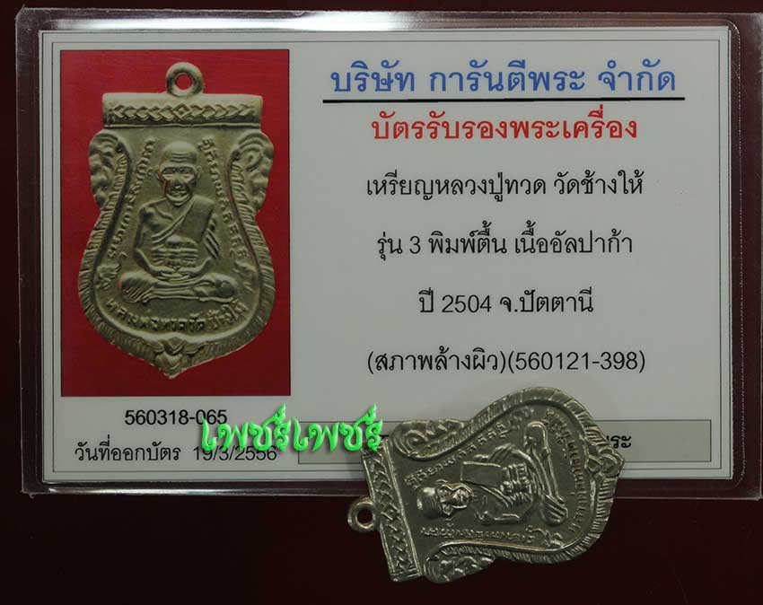 เหรียญ หลวงปู่ทวด วัดช้างให้ รุ่น3 พิมพ์ตื้น เนื้ออัลปาก้า ปี2504 จ.ปัตตานี สภาพสวยบัตรระบุล้างผิวนานแล้วผิวกลับสวยแล้ว พร้อมบัตรรับรองพระแท้จากการันตีพระสบายใจได้พระแท้แน่นอน ค่ะ