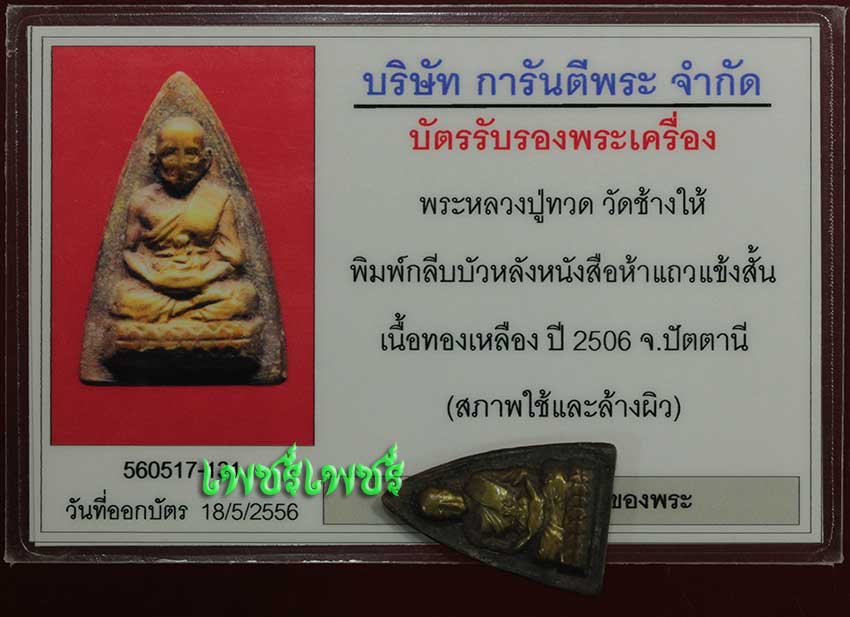 พระหลวงปู่ทวด วัดช้างให้ พิมพ์กลีบบัวหลังหนังสือห้าแถวแข้งสั้น เนื้อทองเหลือง ปี2506 จ.ปัตตานี สภาพพอสวย บัตรระบุล้างผิว พร้อมบัตรรับรองพระแท้จากการันตีพระสบายใจได้พระแท้แน่นอน ค่ะ