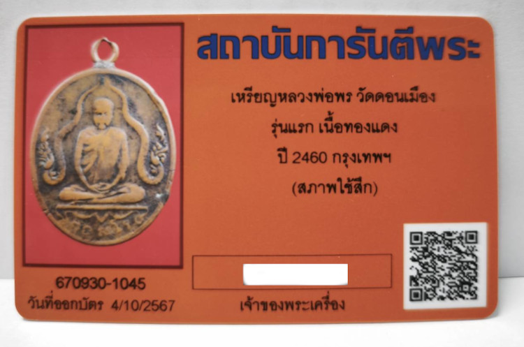 เหรียญหลวงพ่อพร วัดดอนเมือง รุ่นแรก เนื้อทองแดง พร้อมบัตร สภาพใช้สึก