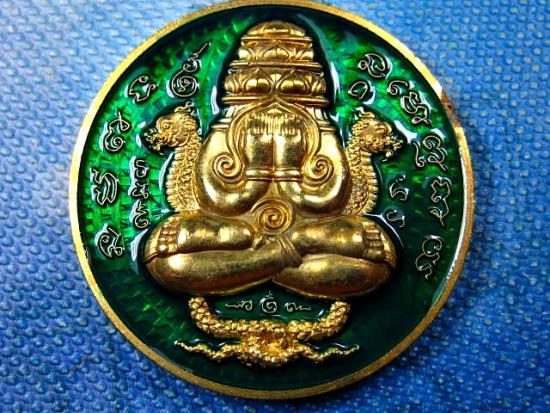 เหรียญปิดตาพังพะกาฬ รุ่นเหนือดวง พระอาจารย์ประสูติ วัดในเตา จ. ตรัง เนื้อ ทองฝาบาตรลงยาสีเขียว (---A60---) |