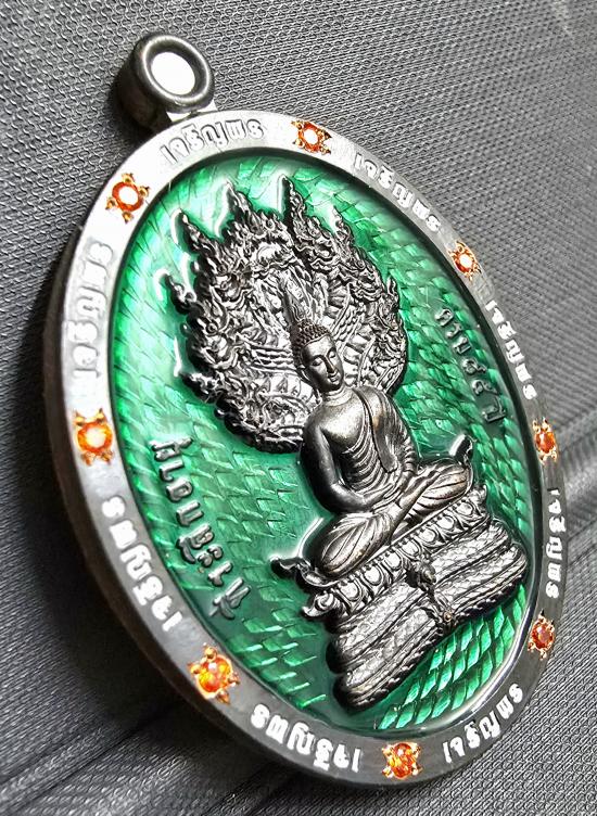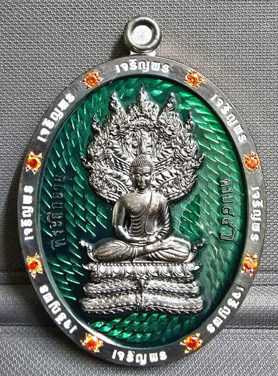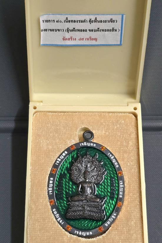 เนื้อทองแดงรมดำ พื้นลงยาเขียว ขอบขาว ขอบฝังพลอยส้มรอบ เหรียญรุ่นนี้ปั้มได้สัดส่วนและสวยมากครับ