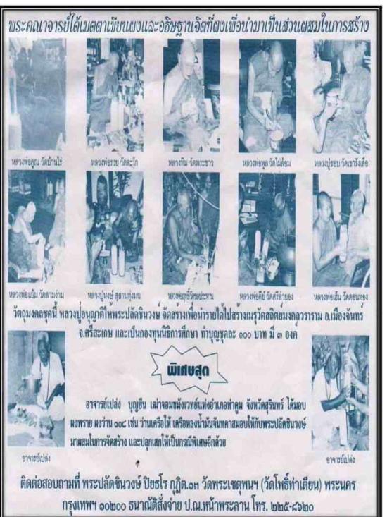 ผงวิเศษจากพระเกจิดังเช่น หลวงพ่อคูณ หลวงพ่อรวย หลวงปู่ทิม หลวงปู่หงษ์ หลวงปู่ฤทธิ์ และผงพราย ผงว่าน อ.เปล่ง บุญยืน และอ.เปล่งปลุกเสกให้กรณีพิเศษ