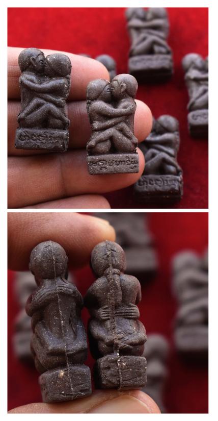 สุดยอดเครื่องรางที่ดีเด่นเป็นยิ่งนักในเรื่องความรัก ที่ไม่ว่าใครจักพกพาบูชาติดตัว จักบังเกิดแต่ผู้คนมารุมรัก มีแต่คนนิยมชมชอบ ใครที่ยังไม่มีคู่ก็จักมีคู่ ใครที่ยังไม่มีแฟน ก็จักได้แฟนมาควงแขนไว้ครองใจ หลวงปู่สร้างตามตำรับสายเหนือ แต่ใช้ผงมหาเสน่ห์สูตรแรงตำรับอีสาน ที่อาจารย์ท่านสอนไว้ ผงนี้ครูหลวงปู่กำชับไว้เป็นหนักหนาว่า อย่าเอาไปใช้ผิดที่ผิดทาง ผิดศีลธรรมจรรยา เพราะจะเกิดเวรกรรมกันเสียเปล่าๆ อย่าว่าแต่มนุษย์เลย ขนาดเทวดานางฟ้าก็ทานทนฤทธานุภาพแห่งผงนี้ไม่ไหว คราวก่อนที่หลวงปู่ปลุกเสกลบผงสูตรนี้ไว้เมื่อ 5 ปีก่อน เคยมีลูกศิษย์ท่านหนึ่งมาขอของดีด้านมหาเสน่ห์เมตตากับหลวงปู่ บอกยังไม่มีภรรยา อยากได้คู่ชิ้นมาเคียงหมอน หลวงปู่ให้ผงนี้ไป เชื่อหรือไม่...??? เพียงแค่ชั่วข้ามคืน หนุ่มรายนั้นได้คู่สมใจ ไม่ใช่แค่หนึ่ง แต่มีเข้ามาให้เลือกเป็นสิบๆราย คิดกันเอาเองนะว่าผงนี้แรงหรือไม่แรง...??? เอาเป็นว่าอิ้นคู่นี้ หลวงปู่ปลุกเสกเน้นเรื่องมหาเสน่ห์ เพื่อให้บังเกิดคนรักและเมตตาเราโดยจำเพาะ ใครที่ชอบนักเรื่องสายมหาเสน่ห์เจ้าชู้ ใครที่ยังไร้คู่ขาดรัก เป็นโสดขึ้นคานมานานปี อยากมีคู่ มีแฟน มีภรรยากับเขาเสียที รีบหามาบูชากันนะ กระซิบให้ว่าผงนี้หลวงปู่จักไม่สร้างและทำผงแรงๆชนิดนี้อีก สร้างไว้ 2 เนื้อ คือ.