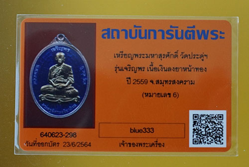 "เคาะเดียวหมายเลขสวย" เหรียญเจริญพร เนื้อเงินหน้าทองคำ หมายเลขสุดสวยหลักเดียว ๖ หลวงพ่อพระมหาสุรศักดิ์ วัดประดู่ สวยๆ กล่องเดิม พร้อมบัตรG-pra