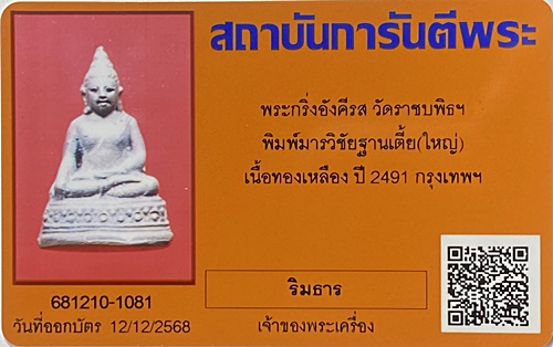 พระกริ่งอังคีรส วัดราชบพิธฯ พิมพ์มารวิชัยฐานเตี็ย(พิมพ์ใหญ่) ปี2491 มีบัตรรับรองจีพระ ก้นมาจารเก่า เคาะเดียว