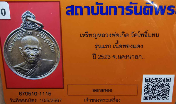 เหรียญหลวงพ่อเกิด วัดโพธิ์แทน รุ่นแรก เนื้อทองแดง ห่วงเดิม ปี2523 จ.นครนายก + บัตรG-pra สภาพเดิมค่ะ พระสภาพตามรูปทุกประการค่ะ
