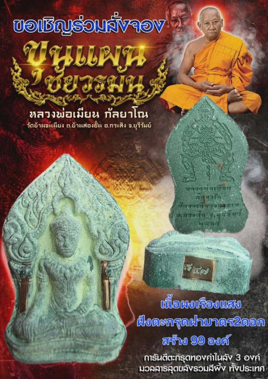 พระขุนแผนชัยวรมันหลังหุ่นพยนต์ หลวงพ่อเมียน วัดจะเนียง บุรีรัมย์ หลวงปู่มหาศิลา (หลวงปู่ศิลา)อธิษฐานจิต เนื้อผงเรืองแสงฝังตะกรุดฝาบาตร 2 ดอกจำนวนสร้างน้อยเพียง 99 องค์เท่านั้น มวลสารเข้มขลัง สวย หายาก ปัจจุบันวัตถุมงคล หลวงพ่อเมียนขยับราคาขึ้นทุกรุ่น พุทธคุณประสบการณ์ของพระเครื่องของท่านยิ่งมากและไม่ธรรมดา จนถึงประสบการณ์ที่ผู้บูชานับถือได้ประสบพบมากับตัวเองแล้วนั้นด้วย วัตถุมงคลหลวงพ่อเมียนประสบการณ์มากมาย ห้ามพลาดด้วยประการทั้งปวงแล้วครับ รับประกันชั้นหนึ่งครับ |