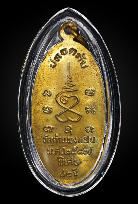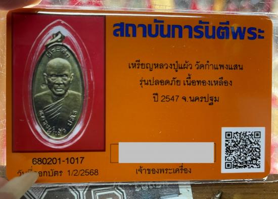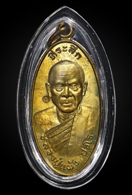 เหรียญใบขี้เหล็กรุ่นแรก หลวงปู่แผ้ว ปี 2547 เนื้อทองฝาบาตร + บัตรรับรอง