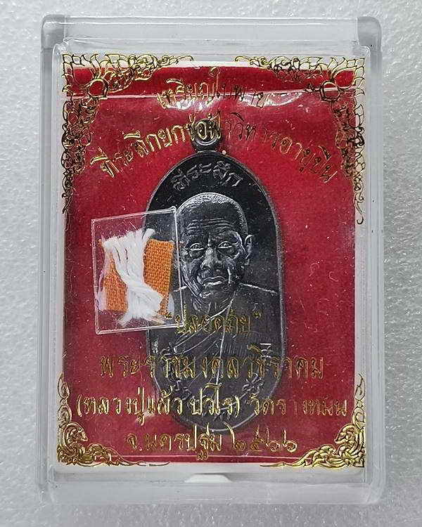 เหรียญใบพาย (เนื้อนวะ) รุ่นแรก หลวงปู่แผ้ว ปวโร วัดรางหมัน พร้อมกล่อง + จีวร,สายสิญจน์