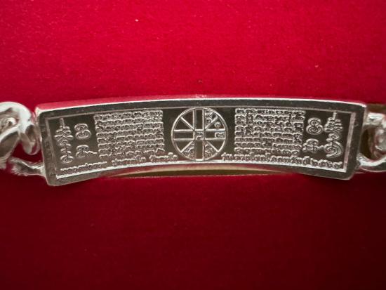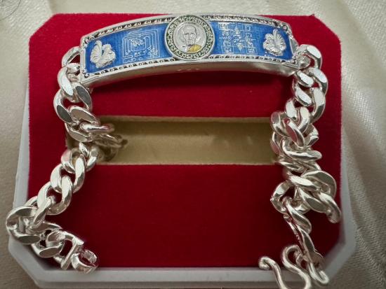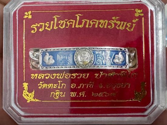 เลสข้อมือ หลวงพ่อรวย วัดตะโก อยุธยา หมายเลข 901 โค๊ต นะ รุ่นรวยโชคโภคทรัพย์ เนื้อเงินลงยาสีฟ้า น้ำหนัก 1 บาท ที่ระลึกแจกกฐิน