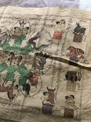 ผ้ายันต์เขียนมือ เพ้นท์สี ยันต์เสน่ห์สายล้านนา ผืนใหญ่ ขนาด 23 นิ้ว ไม่ทราบที่ พิจารณาตามรูป..