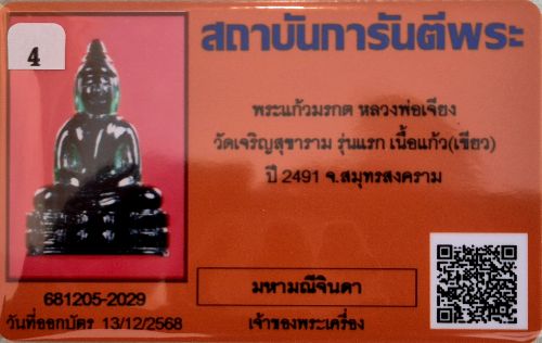 พระแก้ว หลวงพ่อเจียง วัดเจริญสุขารามวรวิหาร รุ่นแรก ปี 2491 เนื้อแก้วเขียว หายาก พร้อมบัตรรับรองครับ