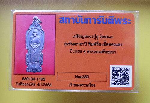 "เคาะเดียว" เหรียญอันตรายาปิ พิมพ์ยืน หลวงปู่ดู่ วัดสะแก เนื้อทองแดง สวยๆ พร้อมบัตรรับรองG-pra |
