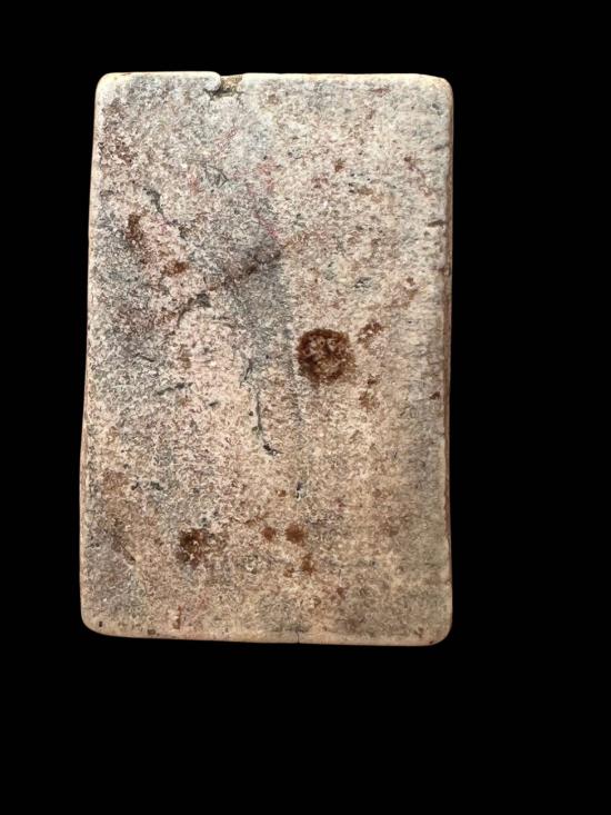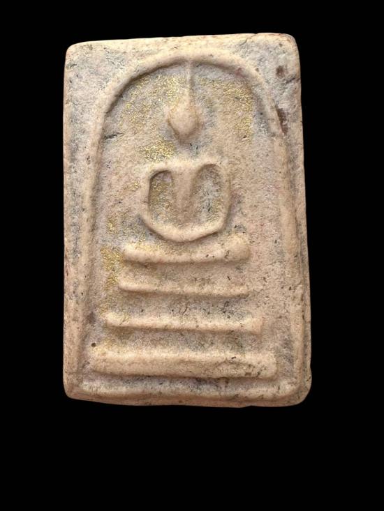 พระสมเด็จเนื้อผงเก่า ไม่ทราบที่ พิมพ์มาตรฐานทรงสี่เหลี่ยม ฐานสามชั้น องค์พระนั่งสมาธิภายในซุ้มโค้ง เส้นฐานและซุ้มยังเห็นเค้าโครงชัด ผิวเนื้อแห้งเก่าตามอายุ มีคราบกรุ คราบฝ้า และร่องรอยการใช้งานจริงตามธรรมชาติ มวลสารเนื้อผงกระจายตัวดี ดูง่าย ไม่ผ่านการล้างหรือแต่งผิว เหมาะสำหรับสายพระสมเด็จที่เน้นบูชาใช้งาน พกติดตัวได้สบายใจ
