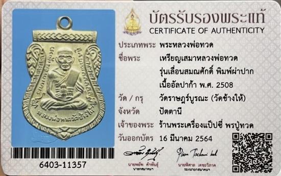 หลวงปู่ทวด เหรียญเลื่อนสมณศักดิ์ เนื้ออัลปาก้าเปลือยผ่าปาก ปี08 พร้อมบัตรรับรองสมาคมและรางวัล