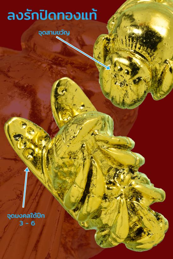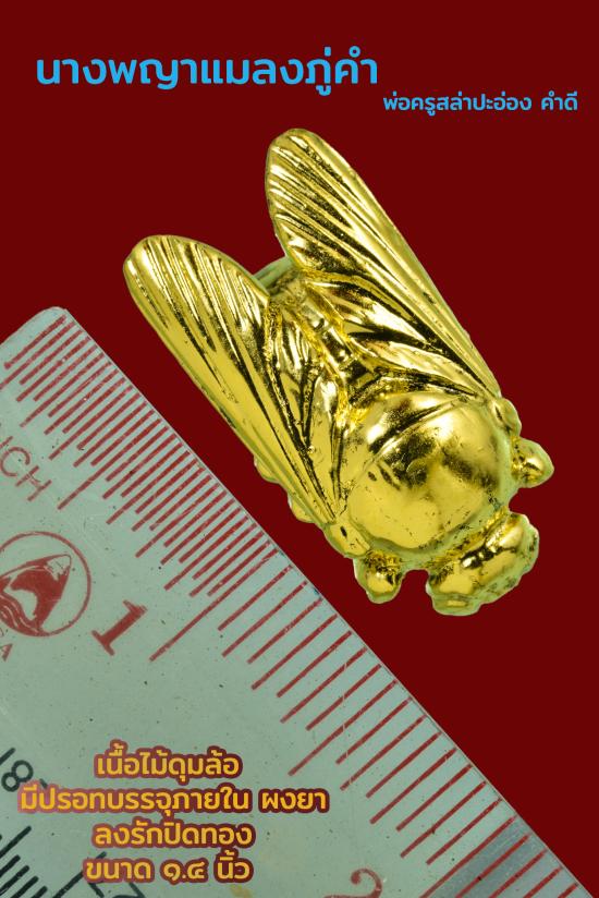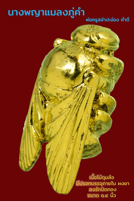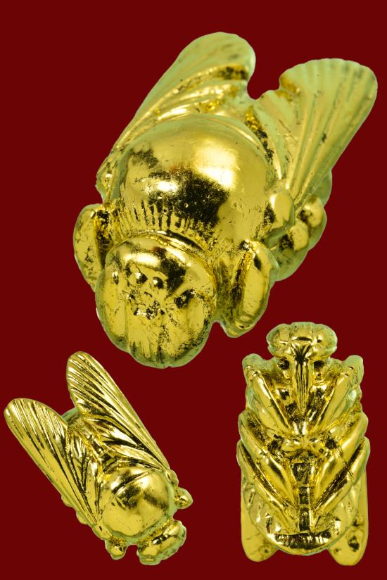 แมลงภู่คำ วัสดุหลัก เนื้อไม้ดุมล้อ ส่วนประกอบ มีปรอทบรรจุภายใน การตกแต่ง ลงรักปิดทอง ขนาด ๑.๔ นิ้ว ผู้แกะ/ผู้สร้าง พ่อครูสละปะอ่อง คำดี |