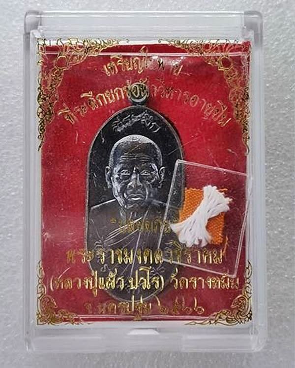 เหรียญใบพาย (เนื้อนวะ) รุ่นแรก หลวงปู่แผ้ว ปวโร วัดรางหมัน พร้อมกล่อง + จีวร,สายสิญจน์