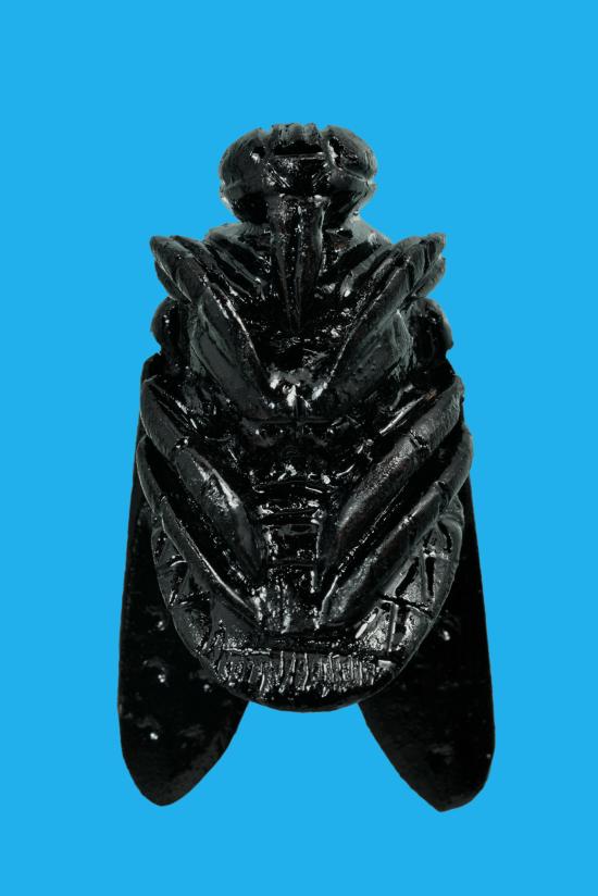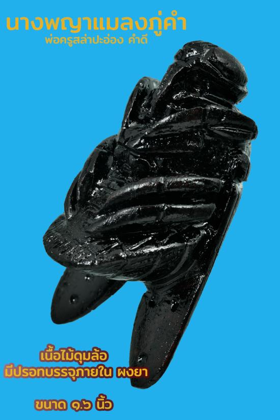 แมลงภู่คำ วัสดุหลัก เนื้อไม้ดุมล้อ ส่วนประกอบ มีปรอทบรรจุภายใน การตกแต่ง ลงรัก ขนาด 1.6 นิ้ว ผู้แกะ/ผู้สร้าง พ่อครูสละปะอ่อง คำดี |