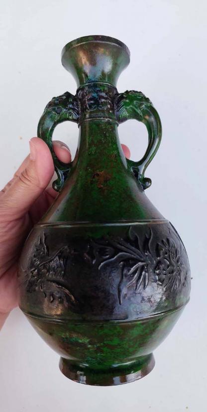 **วัดใจ***แจกันทองสัมฤทธิ์เก่าทรงโบราณ หูมังกร สูง 8.5 นิ้ว ปาก 2.5 นิ้ว
