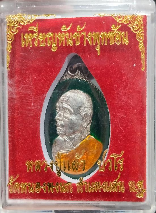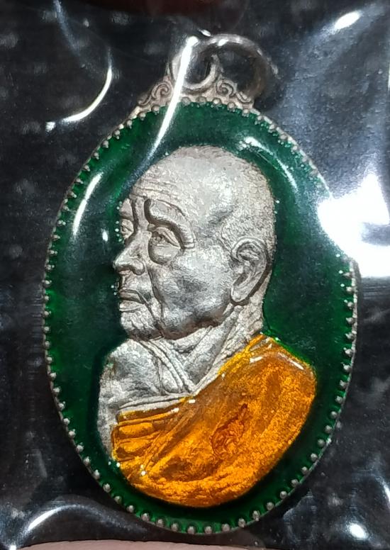 เหรียญหันข้าง เนื้อเงินลงยา ปี 2550 หลวงปู่แผ้ว ปวโร วัดรางหมัน ลงยาสีเขียว หมายเลข 356