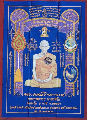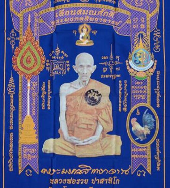 @@@...ผ้ายันต์เลื่อนสมณศักดิ์ หลวงพ่อรวย วัดตะโก อยุธยา สีน้ำเงินขนาด 17x23.5 นิ้ว ปี 2559 มีตราปั๊ม...@@@ ทันหลวงพ่อรวย ปลุกเส