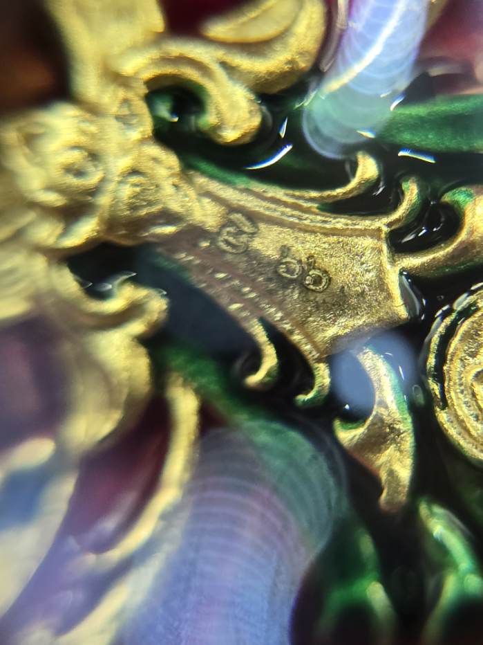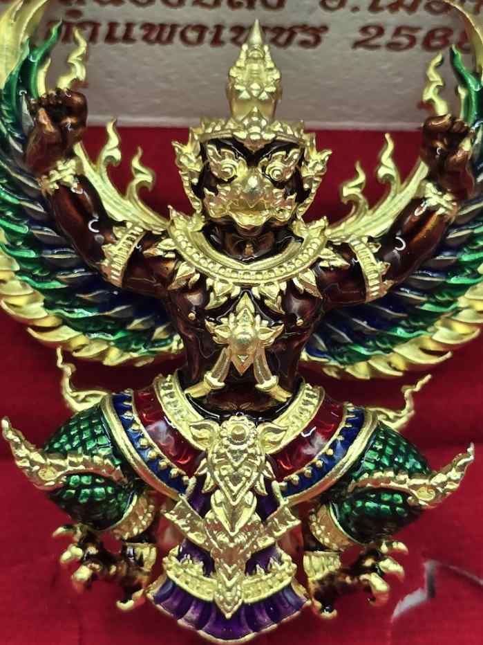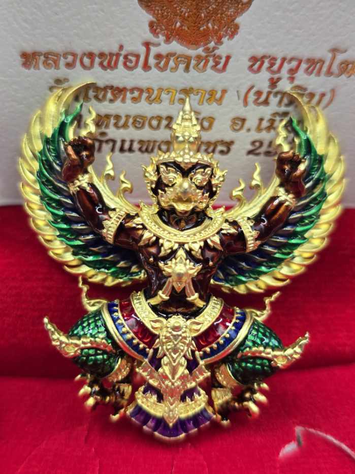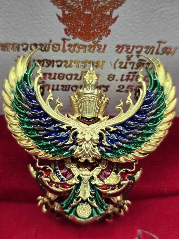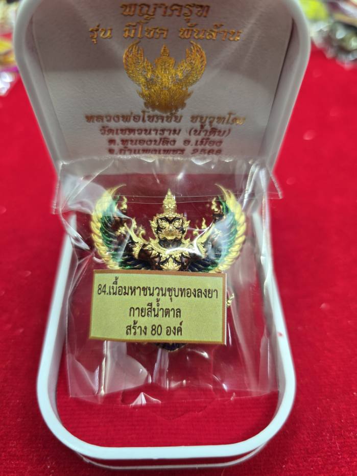 พญาครุฑ รุ่นมีโชคพันล้าน หลวงพ่อโชคชัย วัดน้ำดิบ เนื้อมหาชนวนชุบทองลงยากายน้ำตาล สร้าง 80 องค์ หมายเลข 66