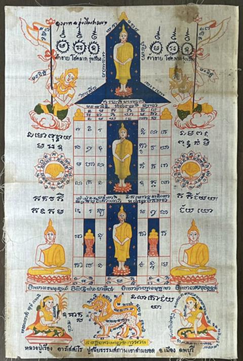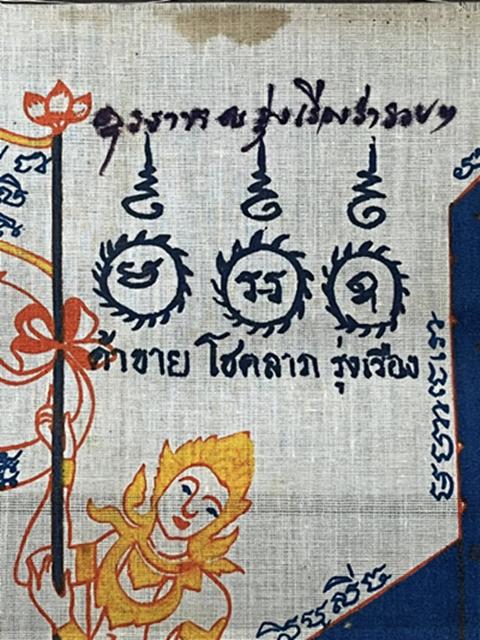 ผ้ายันต์เมตตาค้าขาย รุ่นแรก หลวงปู่เรือง วัดเขาสามยอด ปี 39 ขนาด 37 x 57 เซ็นติเมตร สภาพตามรูป เตาะเดียวแดงครับ