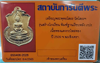 เหรียญพระพุทธโสธร วัดโสธทฯ รุ่นสร้างโรงเรียน พิมพ์ฐานเรียบหลัง ภปร. เนื้อทองแดงกะไหล่ทองปี 2509 สวยเดิมพร้อมบัตร