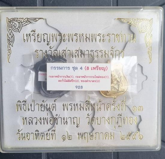 เหรียญพระพรหมพระราชทาน ปี56 พิธีเป่ายันต์พรหมสี่หน้า ครั้งที่13 แยกจากกรรมการชุด 4 เนื้อทองฝาบาตร 1+ เนื้อตะกั่วไม่ตัดปีก 1 เลขนัมเบอร์ 928 เป็นเลขเดียวกันทั้ง 2 เหรียญ ซีลเดิมจากวัดพร้อมกล่องกรรมการ