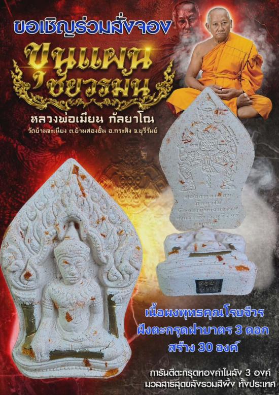 พระขุนแผนชัยวรมันหลังหุ่นพยนต์ หลวงพ่อเมียน วัดจะเนียง บุรีรัมย์ หลวงปู่มหาศิลา (หลวงปู่ศิลา)อธิษฐานจิต เนื้อผงพุทธคุณโรยจีวรฝังตะกรุดฝาบาตร 3 ดอก จำนวนสร้างน้อยเพียง 30 องค์เท่านั้น มวลสารเข้มขลัง สวย หายาก ปัจจุบันวัตถุมงคล หลวงพ่อเมียนขยับราคาขึ้นทุกรุ่น พุทธคุณประสบการณ์ของพระเครื่องของท่านยิ่งมากและไม่ธรรมดา จนถึงประสบการณ์ที่ผู้บูชานับถือได้ประสบพบมากับตัวเองแล้วนั้นด้วย วัตถุมงคลหลวงพ่อเมียนประสบการณ์มากมาย ห้ามพลาดด้วยประการทั้งปวงแล้วครับ รับประกันชั้นหนึ่งครับ |