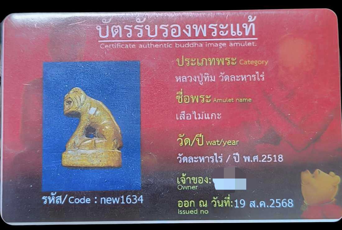 ชื่อพระเครื่อง เสือไม้แกะ หลวงปู่ทิม ปี2518 พร้อมบัตรสายตรงหมีพูห์