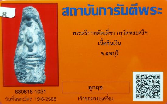 ชื่อพระเครื่อง วัดใจ พระตรีกายตัดเดี่ยว กรุวัดพระศรีฯ เนื้อชินเงิน จ.ลพบุรี พร้อมบัตรรับรองจากจีพระ