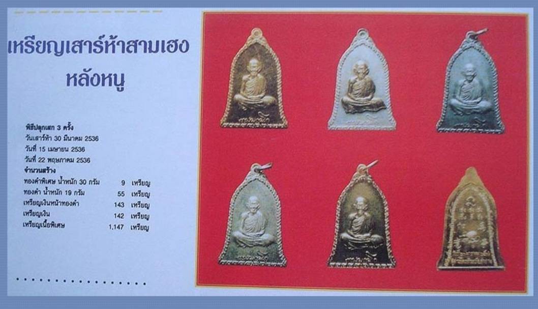 ปี2536 วันที่ 30 มีนาคม 2536 วันที่22พฤษพาคม2536 ล้วนแต่เป็นวันเสาร์ห้าครับ สุดยอดเหรียญหายากสร้างน้อย อีกเหรียญหนึ่งครับ ได้มาพร้อมซองเดิมๆเลยครับ ยิ่งเหรียญนี้ เนื้อนี้ สร้างได้ไม่มากครับ เนื่องจากเป็นเนื้อ ลูกสูบเรือเดินสมุทร ตอนที่นำเนื้อลูกสูบมาหลอม ทำเนื้อนั้น สร้างได้ไม่ถึงห้าร้อยเหรียญ เมื่อเนื้อลูกสูบเย็นตัวลง ก้อไม่สามารถนำกลับมาหลอมสร้างใหม่ได้อีกครั้ง สรุปว่าหายาก