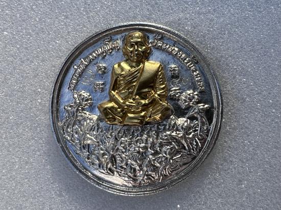 เหรียญรูปเหมือนฐานปูปลา เนื้อเงินหน้าทองคำ ปี2550 หลวงพ่อสาคร วัดหนองกรับ สร้าง70เหรียญ
