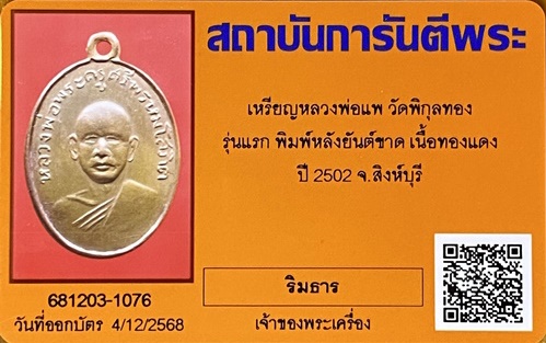 เหรียญหลวงพ่อแพ วัดพิกุลทอง รุ่นแรก ปี2502 พิมพ์หลังยันต์ขาด เนื้อทองแดง (มีบัตรรับรองจีพระ) เคาะเดียว