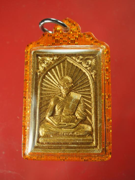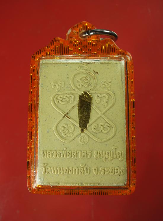 พระผงเศียรเล็ก เหลือง ผสมเนื้อผงพรายกุมาร ทาทอง ตระกรุตทองคำ หลวงพ่อสาคร วัดหนองกรับ ระยอง ปี 2548 สร้างน้อย 657 องค์ พร้อมเลี่ยม ( ขนาดความสูง 3.3 กว้าง 2.1 ซม. )