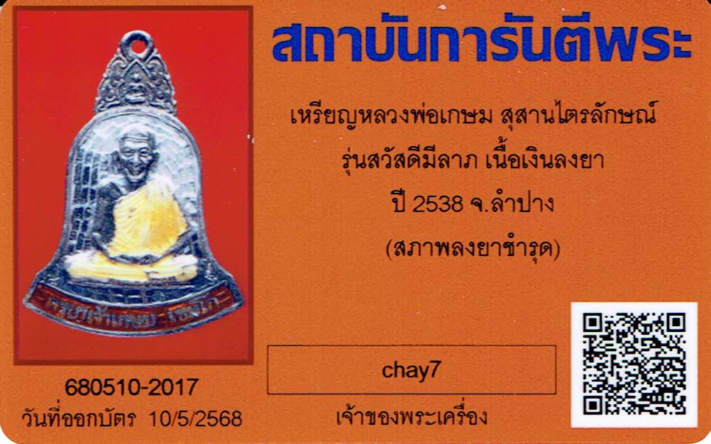 เหรียญหลวงพ่อเกษม รุ่นสวัสดี มีลาภ เนื้อเงินลงยา พร้อมบัตรรับรองการันตีพระ