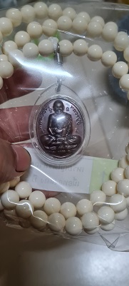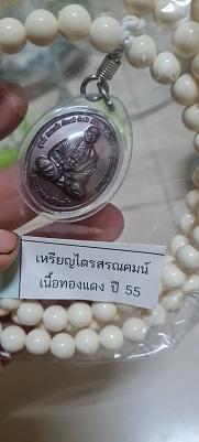 เหรียญไตรสรณคมน์ เนื้อทองแดง หลวงตาม้า วัดถ้ำเมืองนะ พร้อมรอยจารหลวงตาม้า เลี่ยมจากวัดพร้อมประคำ