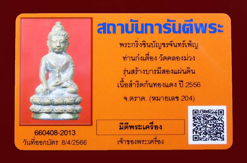 แดงที่เคาะแรก !!! พระกริ่งชินบัญชรจันทร์เพ็ญ เนื้อสำริดก้นทองแดง ท่านก๋งเตื่อง เตชปัญโญ มีกล่องเดิม (หมายเลข 204) + บัตรพระแท้ |