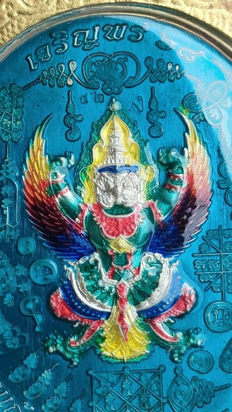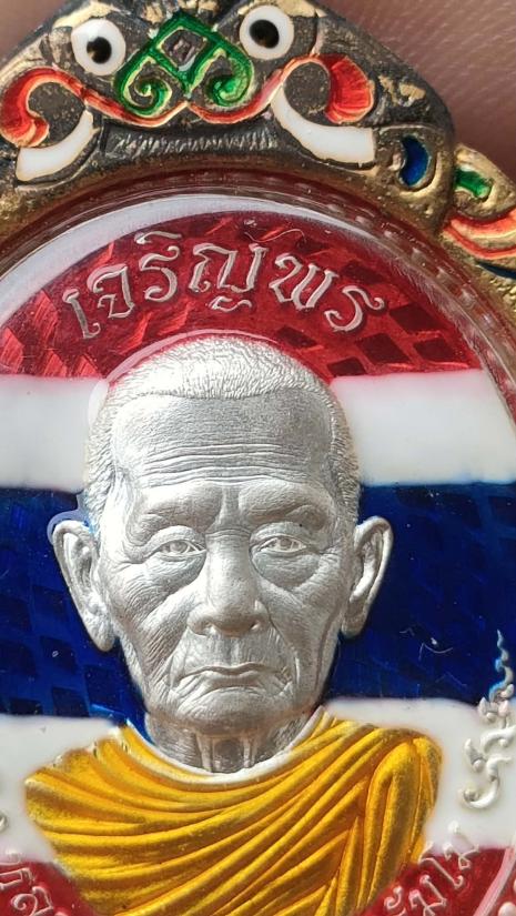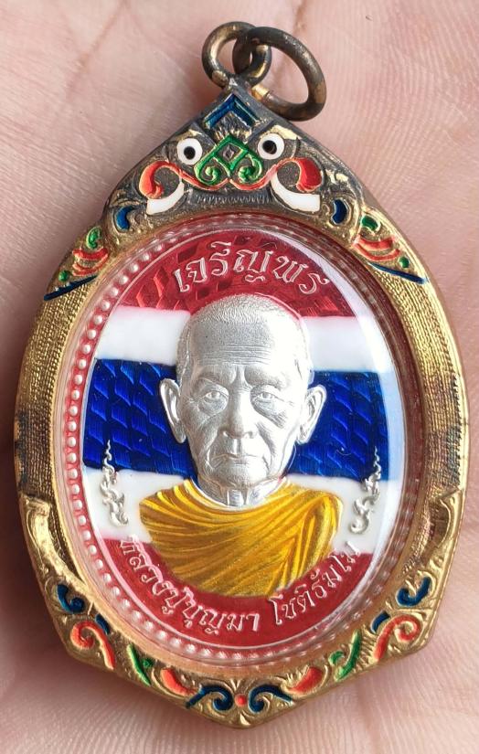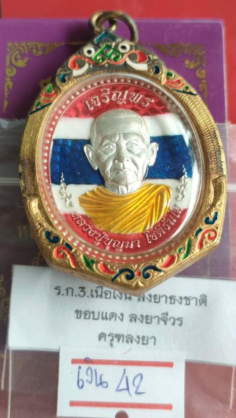 เหรียญ"เจริญพร๖๘"ที่ระลึกครบ๗รอบ หลวงปู่บุญมา โชติธัมโม วัดเขาแก้วทอง จ.ปราจีนบุรี เนื้อเงิน ลงยาธงชาติ ขอบแดง ลงยาจีวร หลังลงยาพญาครุฑ หมายเลข ๔๒ (เลี่ยมกรอบชุบทองลงยา)