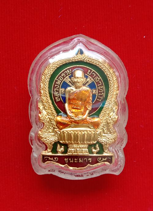 เหรียญนั่งพานชนะมาร หลวงพ่อรวย วัดตะโก ปี2558 เนื้อกะไหล่ทองลงยา