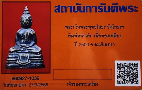 พระกริ่งหลวงพ่อโสธร ปี2500 พิมพ์หน้าเล็ก เนื้อทองเหลือง พร้อมบัตรรับรอง GPRA