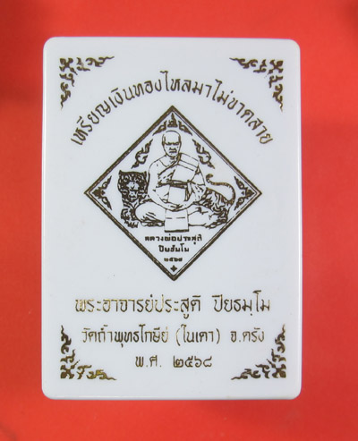 - เหรียญพิมพ์ข้าวหลามตัด"เงินทองไหลมาไม่ขาดสาย"หลวงพ่อประสูติ ปิยธัมโม วัดถ้ำพระพุทธโกษีย์(ในเตา)จ.ตรัง เนื้อชนวนมวลสารไม่ตัดปีก หน้ากากชุบทองคำขาว No 70