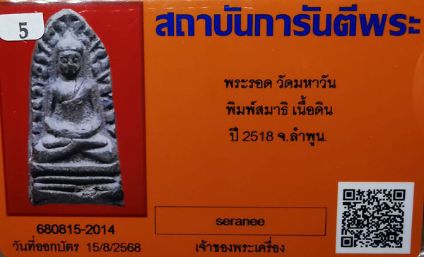 พระรอด วัดมหาวัน พิมพ์สมาธิ(มีหน้าตา) เนื้อดิน ปี2518 จ.ลำพูน + บัตรG-pra สภาพเดิมค่ะ |