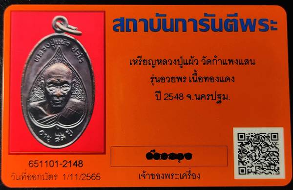 เหรียญหลวงปู่แผ้ว ปวโร เหรียญอวยพร ออกวัดกำแพงแสน 2548 เนื้อทองแดง สวย แรงด้วยประสบการณ์ พร้อมบัตร G...